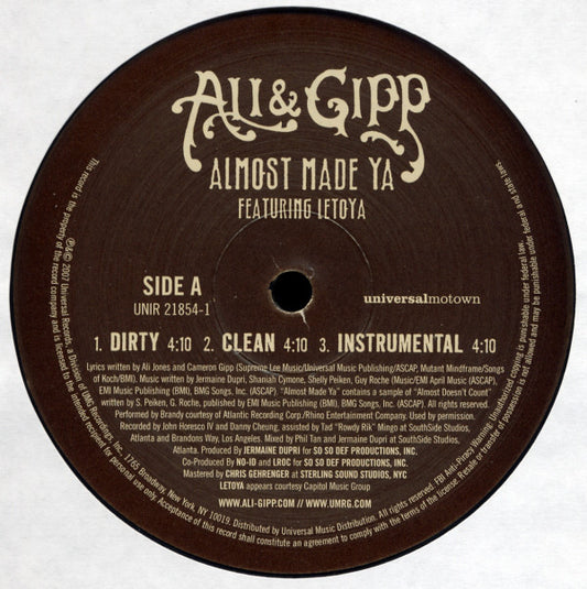 Ali & Gipp Featuring Letoya - Almost Made Ya (12", Promo) (Very Good Plus (VG+))