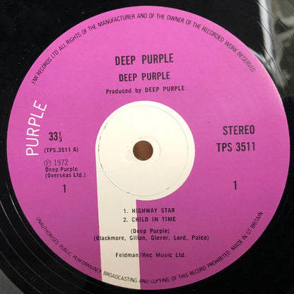 On the labels: Feldman/Hec Music Ltd. ℗1972 Deep Purple (Overseas) Ltd. Made in Gt. Britain On the sleeve Catalog# rear sleeve and spine: TPSP 351 (IE 192 o 93915-6) E.M.I Records (The Gramophone Company Ltd.) Hayes • Middlesex • England Made and Printed in Great Britain Printed and made by Garrod & Lofthouse Ltd. Gatefold sleeve laminated on the outside. Recorded live in Japan A1: Osaka - 16th August 1972 A2: Osaka - 16th August 1972 B1: Osaka - 15th August 1972 B2: Tokyo - 17th August 1972 C1: Osaka - 16th August 1972 C2: Tokyo - 17th August 1972 D: Osaka - 16th August 1972 Early 1980s repress.