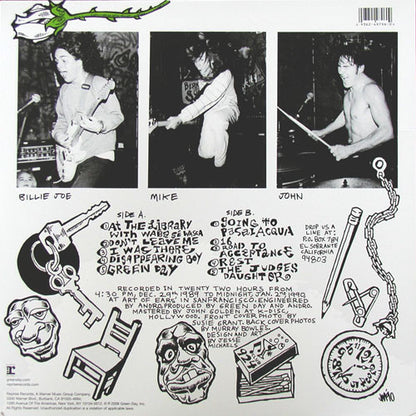 120 gram vinyl. Includes the 39/Smooth LP with a full-size insert, and separate 7" reissues of 1,000 Hours (with folded blue insert) and the Slappy E.P. (no insert), which are both marked 'Promotion Only.' 39/Smooth disc label is marked "Made In Germany." The 7" labels are marked "Manufactured In Germany." A1 to B5: [r368728 originally released in 1990 on Lookout! Records. [back cover Drop us a line at: P.O BOX 784 El Sobrante California 94803 Recorded in twenty two hours from 4:30 PM, Dec. 29th, 1989 to Midnight, Jan. 2nd, 1990, at Art Of Ears in San Francisco. Reprise Records, A Warner Music Group Company. 3300 Warner Blvd., Burbank, CA 91505-4694; 1290 Avenue Of The Americas, New York, NY 10104-0012. (c)(p) 2008 Green Day, Inc. All Rights Reserved. Unauthorized duplication is a violation of applicable laws. greenday.com repriserecords.com C1 to D2: [r472031 originally released in 1989 on Lookout! Records. [insert Thank You! We'll play anywhere, write us at Po box 784 El Sobrante, CA. 94803 (c) 1991 Green Daze Music (ASCAP). Lyrics Reprinted by Permission. All Rights Reserved. (c) 2008 Green Day, Inc. Printed in USA. [back cover Reprise Records, A Warner Music Company. 3300 Warner Blvd., Burbank, CA 91505-4694; 1290 Avenue Of The Americas, New York, NY 10104-0012. (c)(p) 1991 Green Day, Inc. Printed in Canada. All Rights Reserved. Unauthorized duplication is a violation of applicable laws. Promotion Only. Not For Sale. greenday.com repriserecords.com E1 to F2: [r472030 originally released in 1990 on Lookout! Records. [back cover Recorded in a few hours on April 20th, 1990 at Art Of Ears Studio, San Francisco. Mixed April 23rd in a few more hours. "39/Smooth" L.P. and "1000 Hours" E.P. are also available on Reprise. Drop us a line at: P.O Box 784. El Sobrante, CA. 94803 Reprise Records, A Warner Music Company. 3300 Warner Blvd., Burbank, CA 91505-4694; 1290 Avenue Of The Americas, New York, NY 10104-0012. (c)(p) 1991 Green Day, Inc. Printed in Canada. All Rights Reserved. Unauthorized duplication is a violation of applicable laws. Promotion Only. Not For Sale. greenday.com repriserecords.com