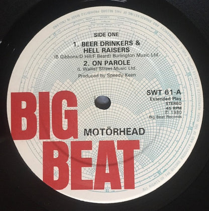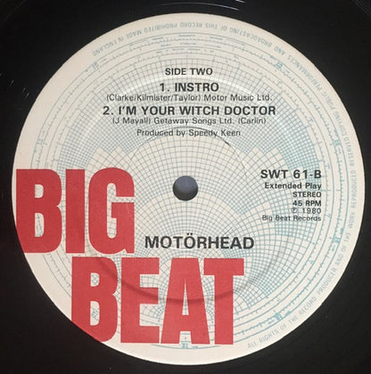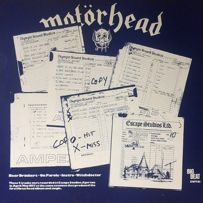 Dark blue sleeve, black vinyl. Back cover: These 4 tracks were recorded at Escape Studios, Egerton, in April/May 1977 at the same sessions that produced the first Motorhead album and single. Track A1 is titled Beer Drinkers Track B2 is titled Witchdoctor Labels: Publishers: A1 Burlington Music Ltd. A2 Street Music Ltd. B1 Motor Music Ltd. B2 Getaway Songs Ltd. (Carlin) ℗ 1980 Big Beat Records Made in England Runouts: All is etched