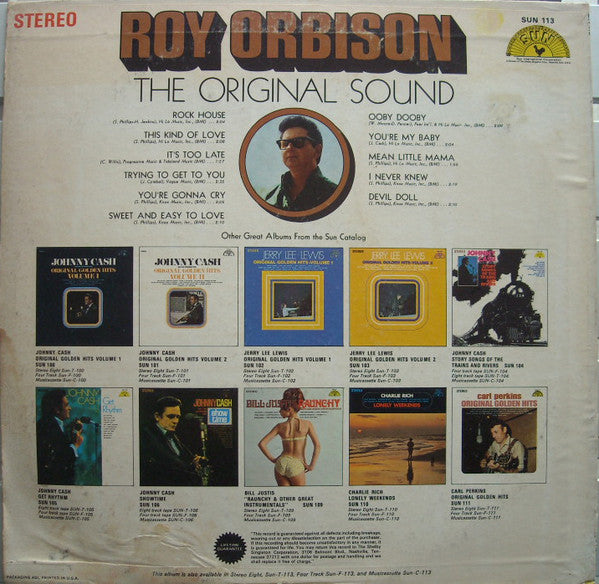 PACKAGING AGI, PRINTED IN U.S.A. A4 is credited Johnny Cymbal, but this title is actually written by Charles Singleton / Rose Marie McCoy. Many titles is credited to Sam Phillips, but these titles are actually written by Roy Orbison himself. Runouts are etched. "Problem child" (B6) is missing on this re-issue.